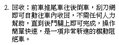 尾車牽引至佈放區時,由隨車人員將運輸安全卡榫放開,並將操控導線放置駕駛艙內。